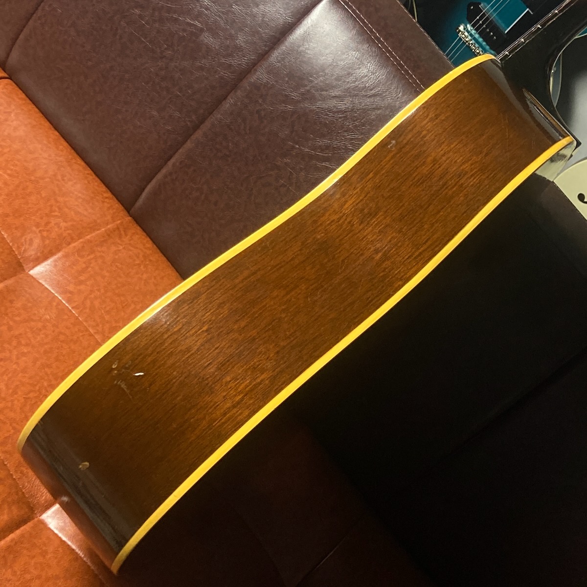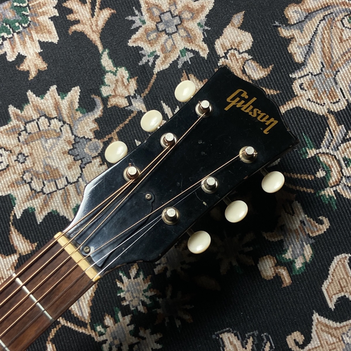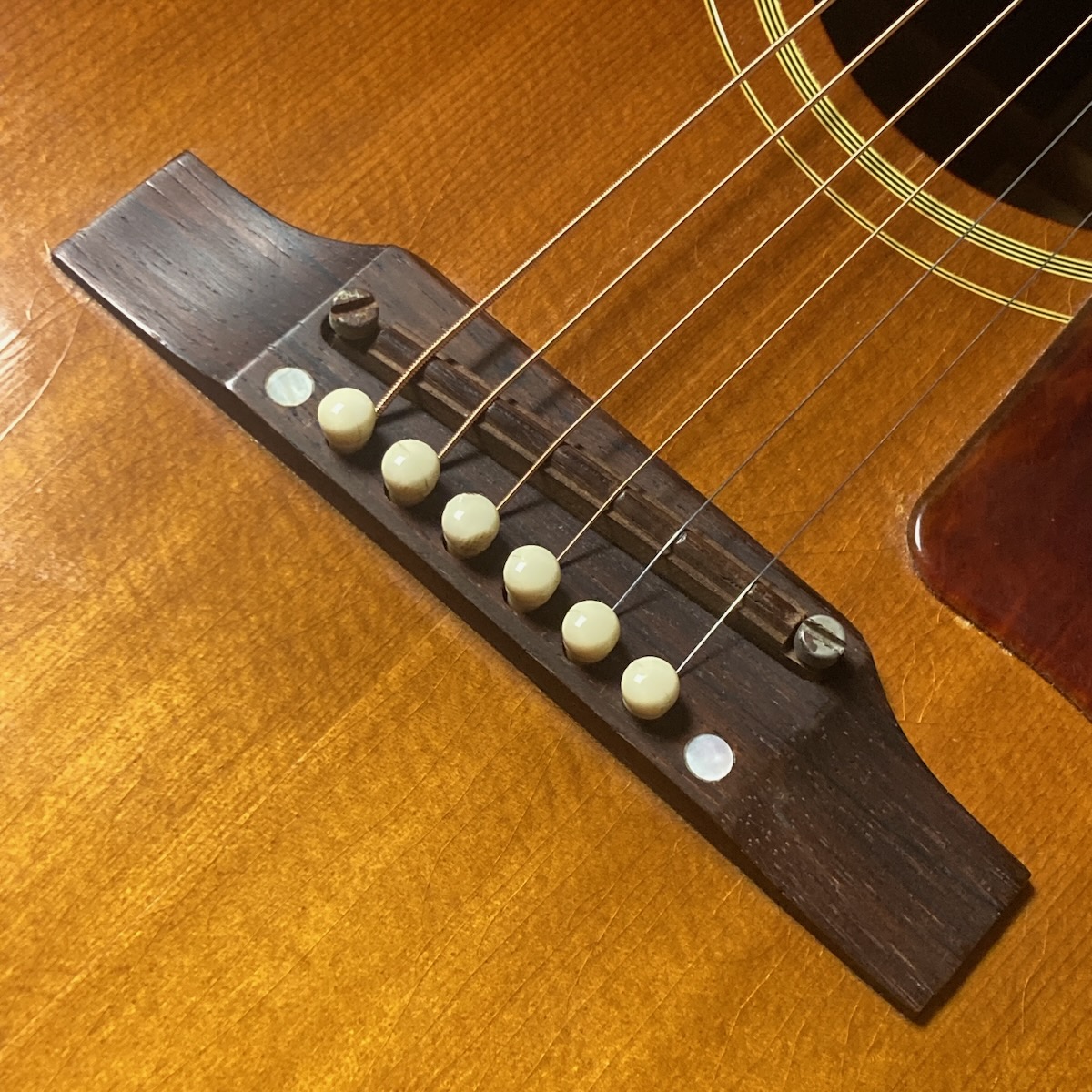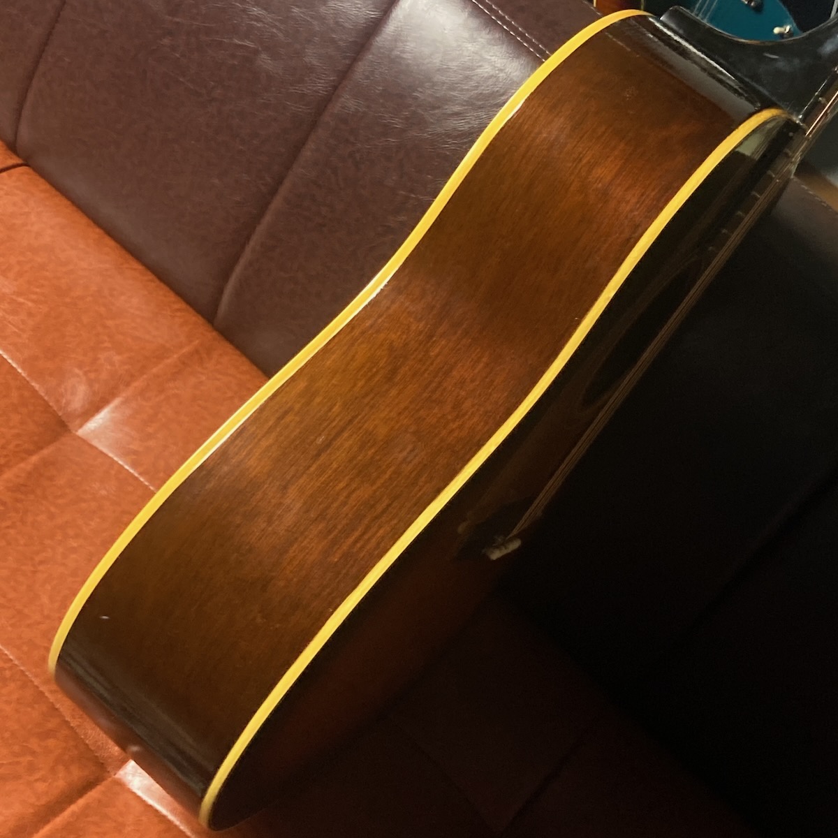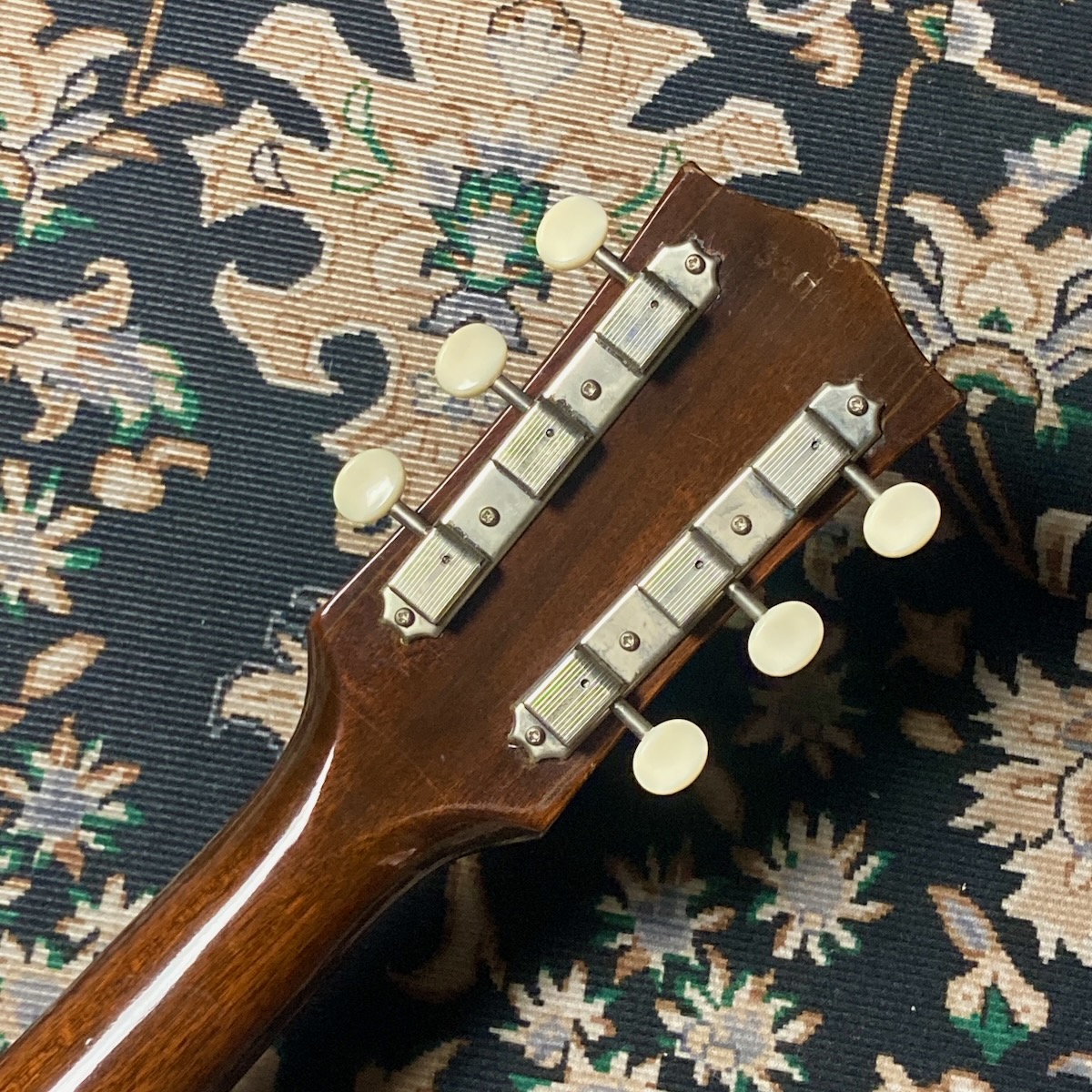 14度のヘッド角、ナット幅約39mmのナローネックにアジャスタブル・サドル、ロゴ入りのラージガードにダブルリング・ロゼッタ等が特徴の年式。さらに、この前年あたりからの復活となったブラウンカラーのサンバーストは、50年代とも違った色味がクールです。