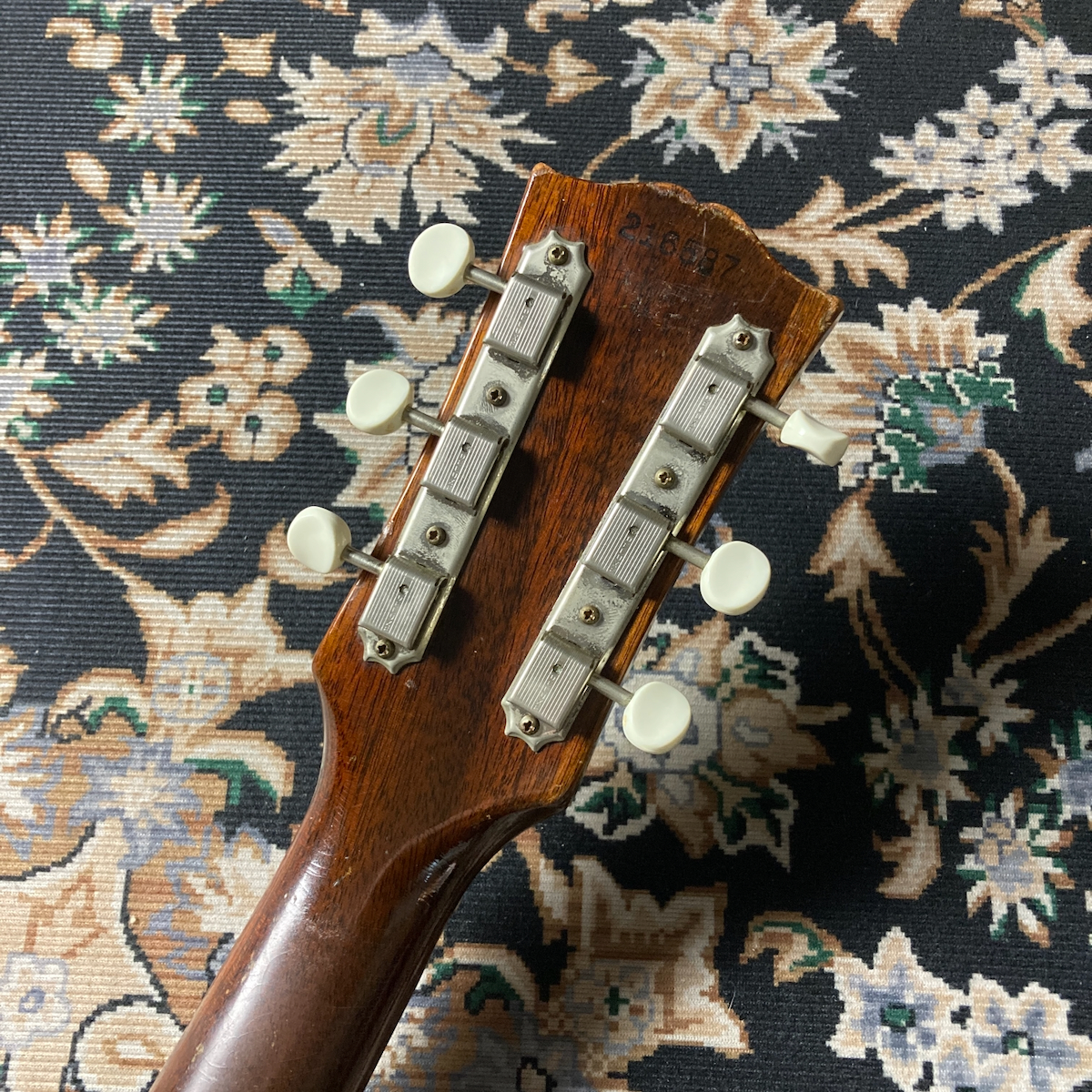 ハカランダと見られる指板も黒々としており、ネックやボディーサイド&バックのマホガニー、ブラウンのサンバーストカラーを含め、非常に雰囲気の良い個体です。