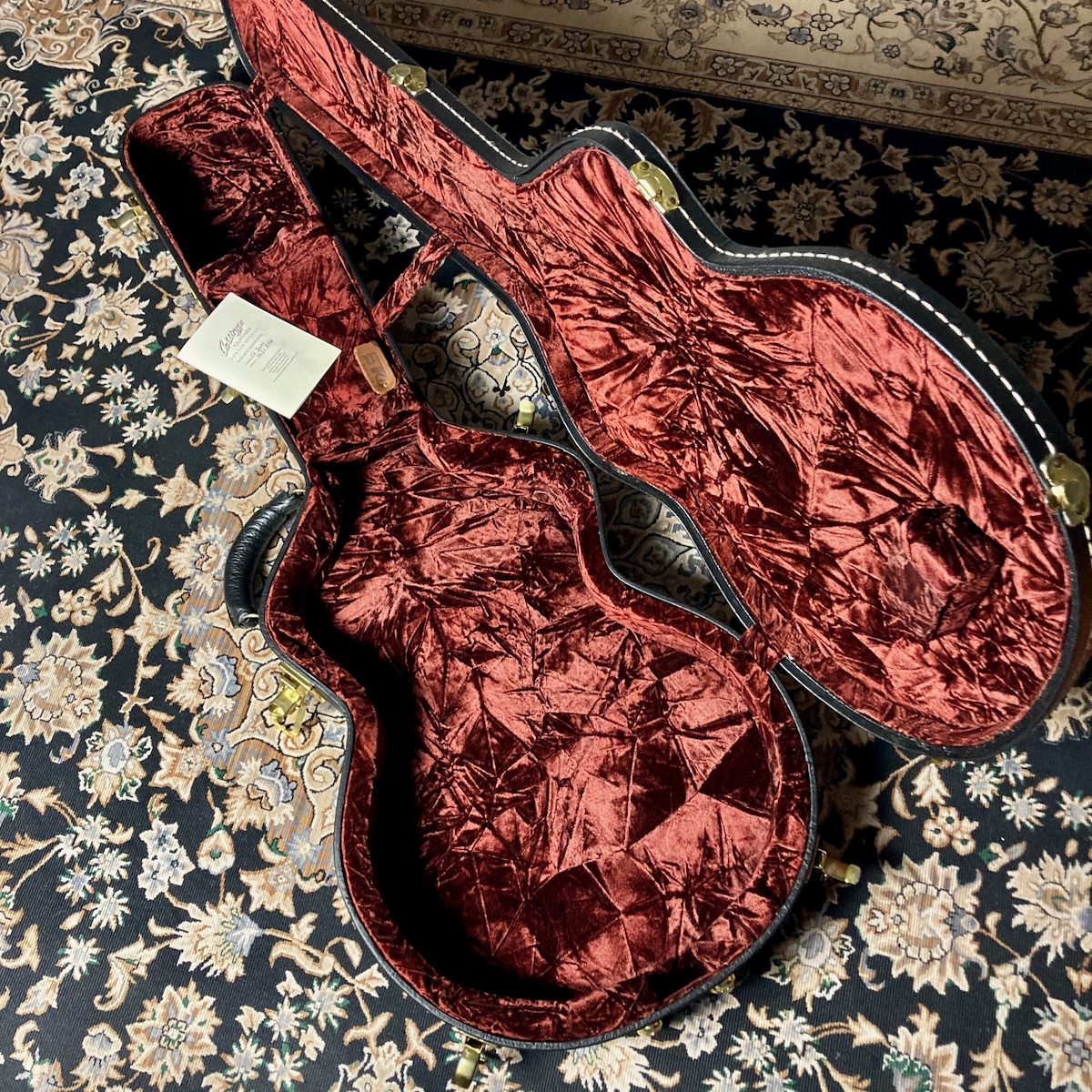 小振りな15インチ幅、2 1/2インチ厚のボディーは、トップに削り出しのヨーロピアン・スプルース、バックに1ピース-ホンジュラス・マホガニーをくり抜いたフルホロー構造。