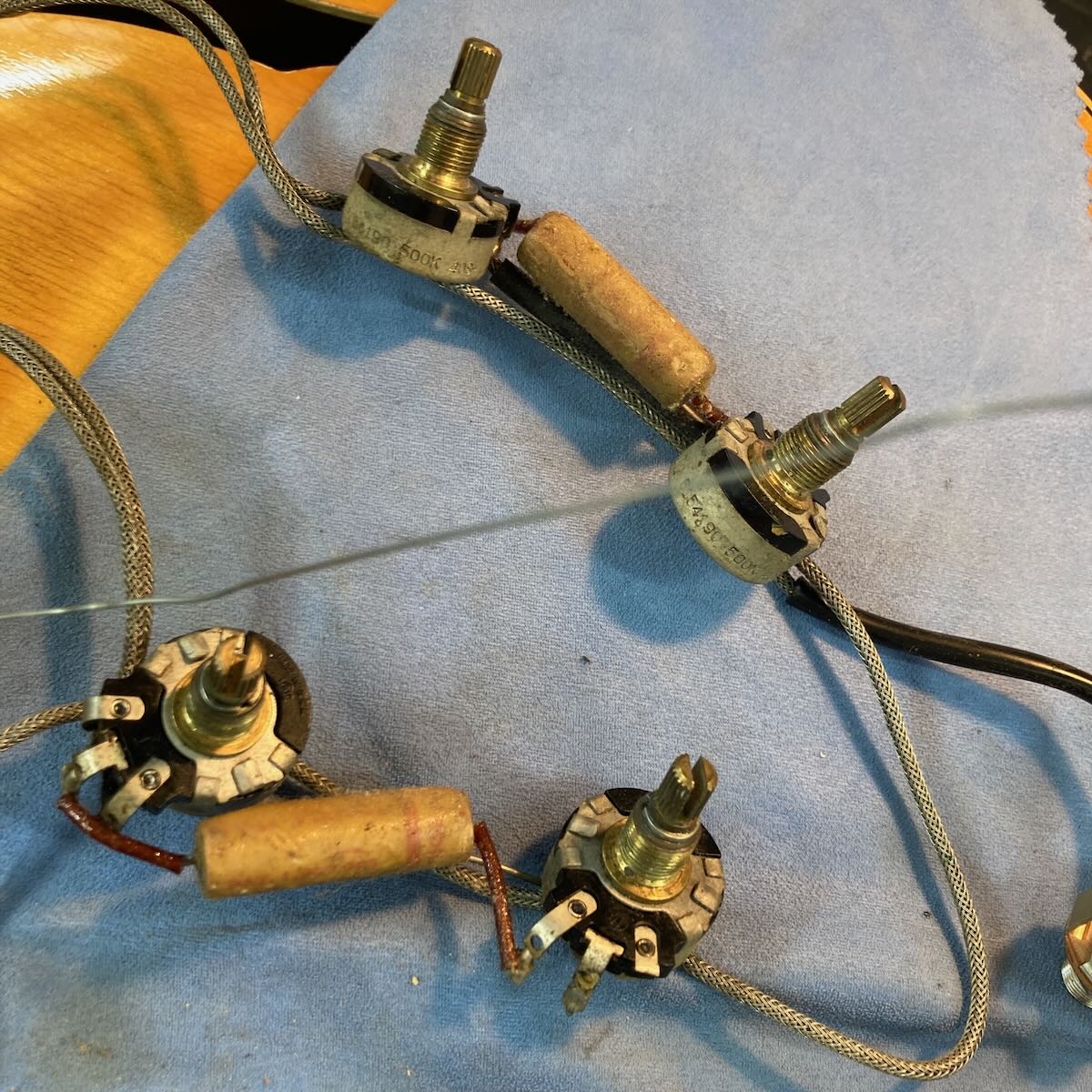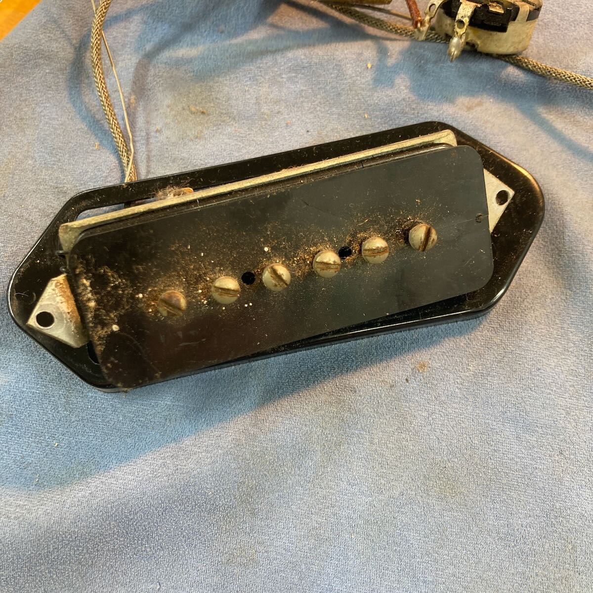 オリジナルの初期型P-90ドッグイヤーP.Uが2発、ポット(IRC54年)やコンデンサー(グレイタイガー)もオリジナルをキープ。(ハンダバージンですが、配線が通常と異なり、ミックス時に片方のヴォリュームを0にしても片方のP.Uは出力されます)Kluson No Line チューナーやピックガード、ノブはオリジナル。