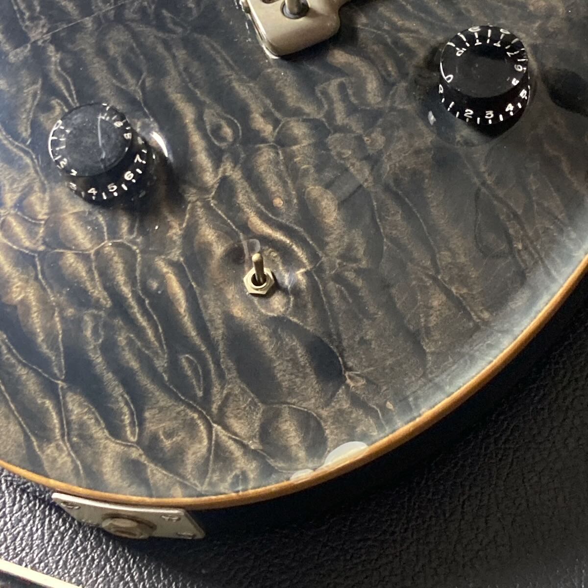 最上級のキルトメイプル・トップに、指板はもちろんダークカラーで非常にオイリーな質感のハカランダを使用。