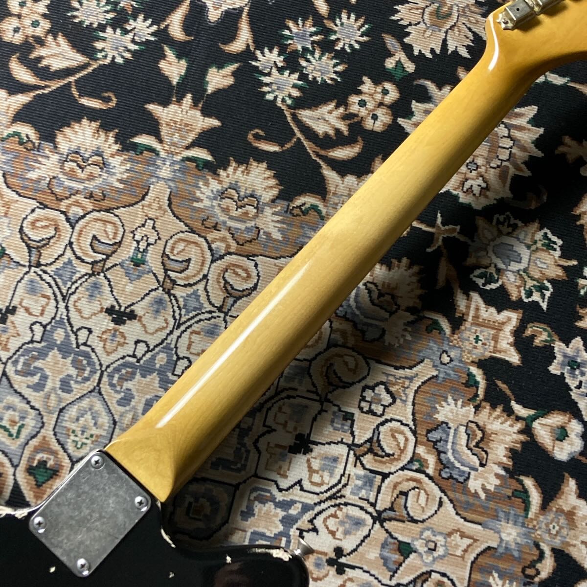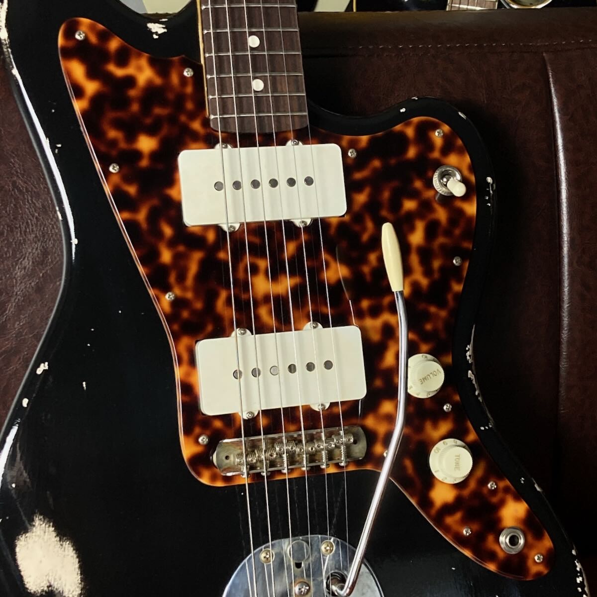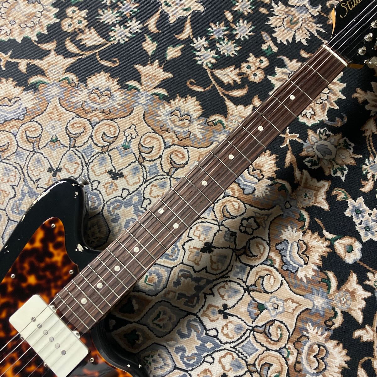 鼈甲柄ながらも、他ではなかなか見かけないレトロな風合いのピックガードに、細かなチェッキングとエイジド加工が施された/ブラックカラー/マッチングヘッドが見事に調和。