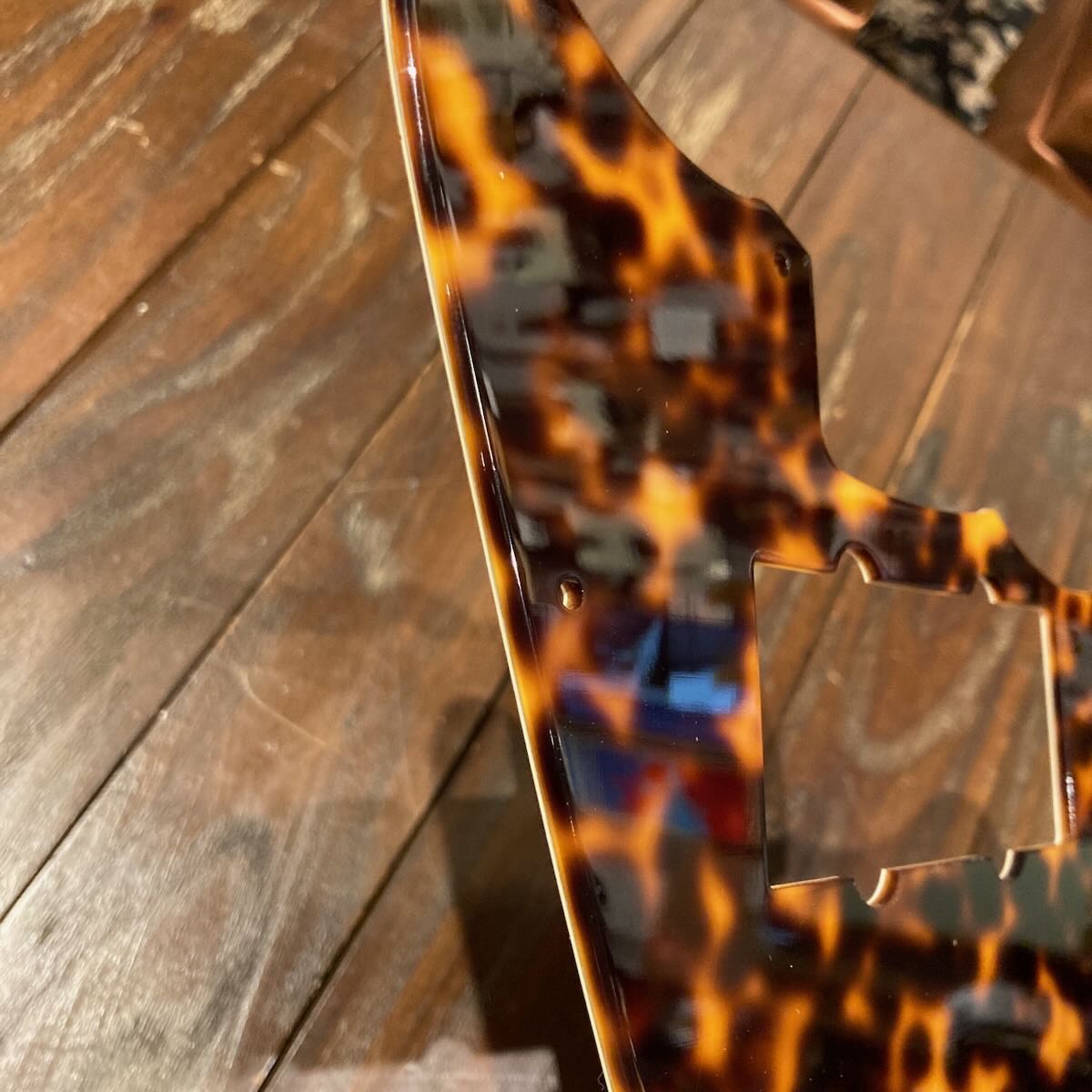 ピックガードには世界三大眼鏡生産地の一つとされる、福井県鯖江市の眼鏡工房 stone-D eyewear によるワンオフのハンドメイド品を採用。眼鏡のセルフレームに使われるアセテートのデッドストック材をこのモデルの為に工場にて選定、ピックガードの製作を依頼しました。
