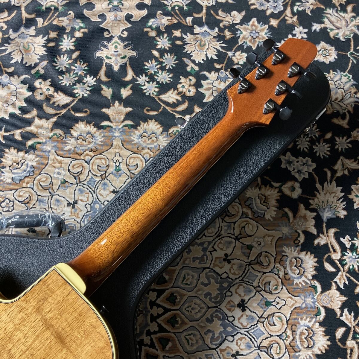 マホガニー/セットネック構造(ミディアムスケール)にエボニー指板の組み合わせ。