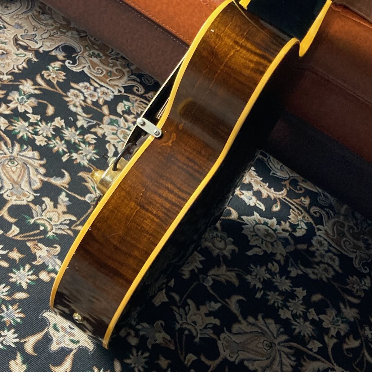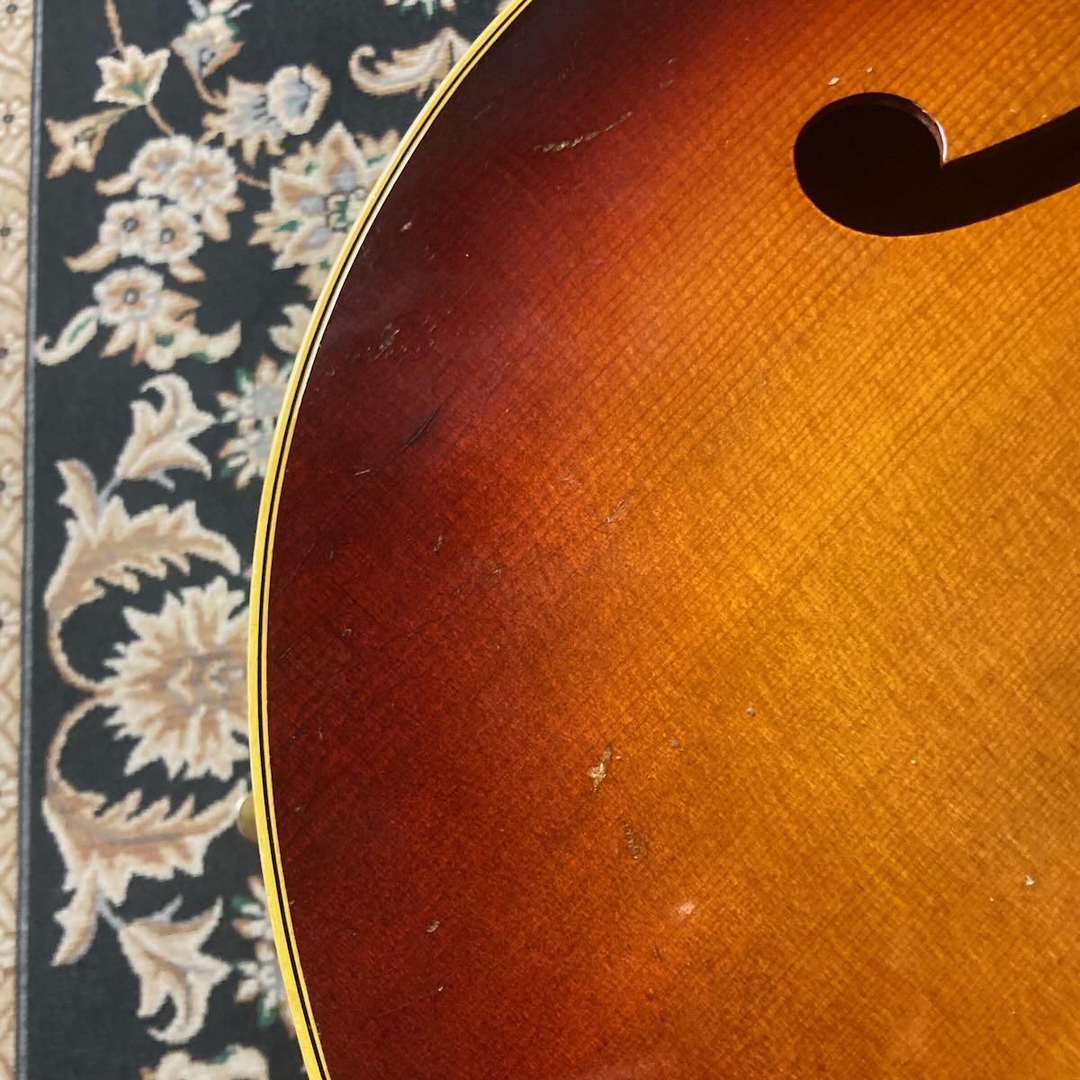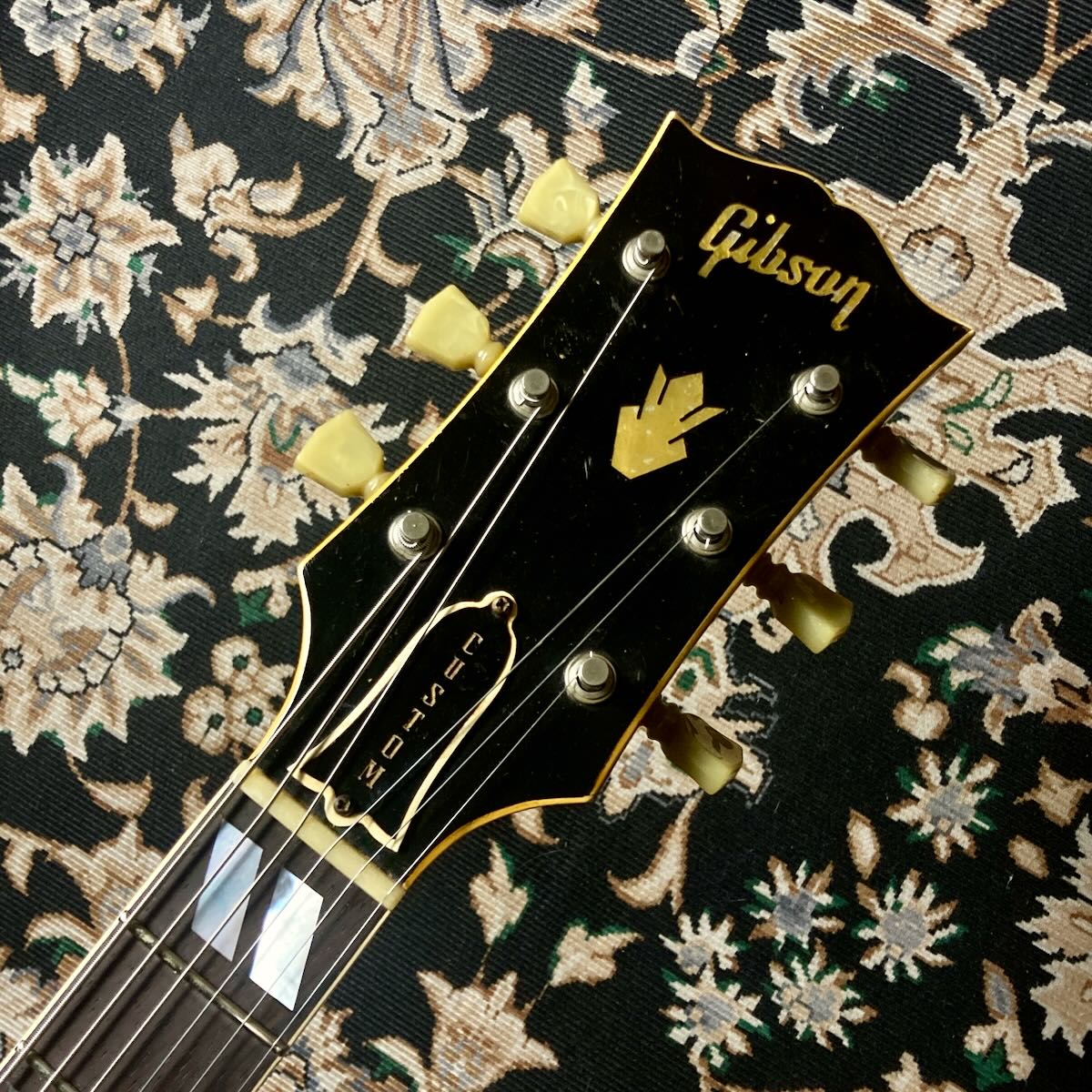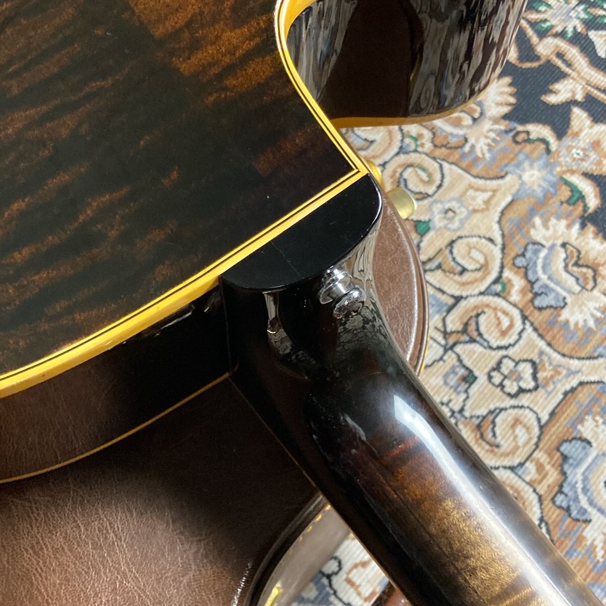 ブリッジサドル部が交換、ストラップピンが交換されヒール部に追加。オリジナルのKluson 2コブ チューナー、トラスロッドカバーはL-5等のCustomロゴのものに交換されています。サウンドホール内のラベルは健在です。