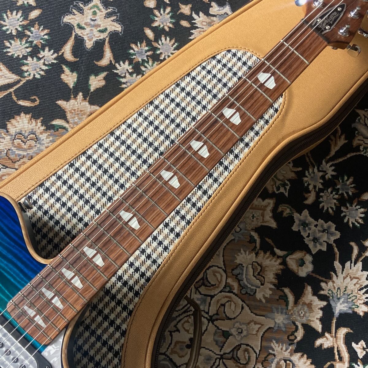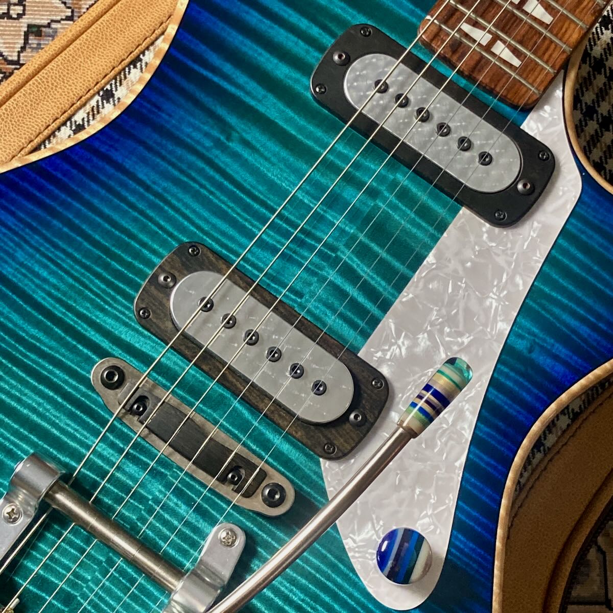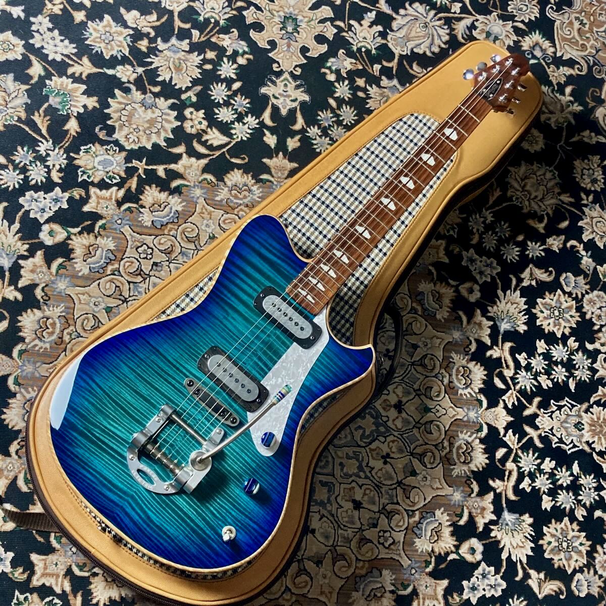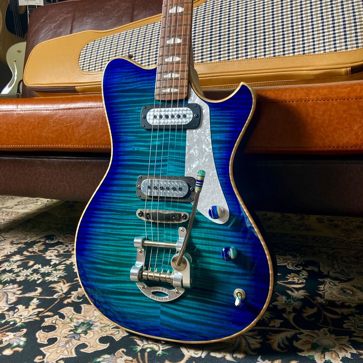 ボディーは海の色を思わせるブルーラグーン・カラーにフレイム杢が美しいメイプルトップ、ホロウ構造のアーバンアッシュバックを採用。クラシックカーやスケート、サーフボードを連想させる非対称のボディーシェイプは非常にクール。