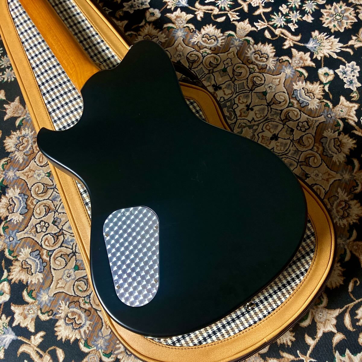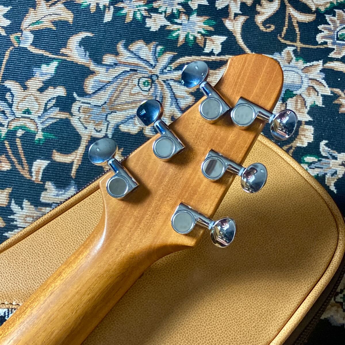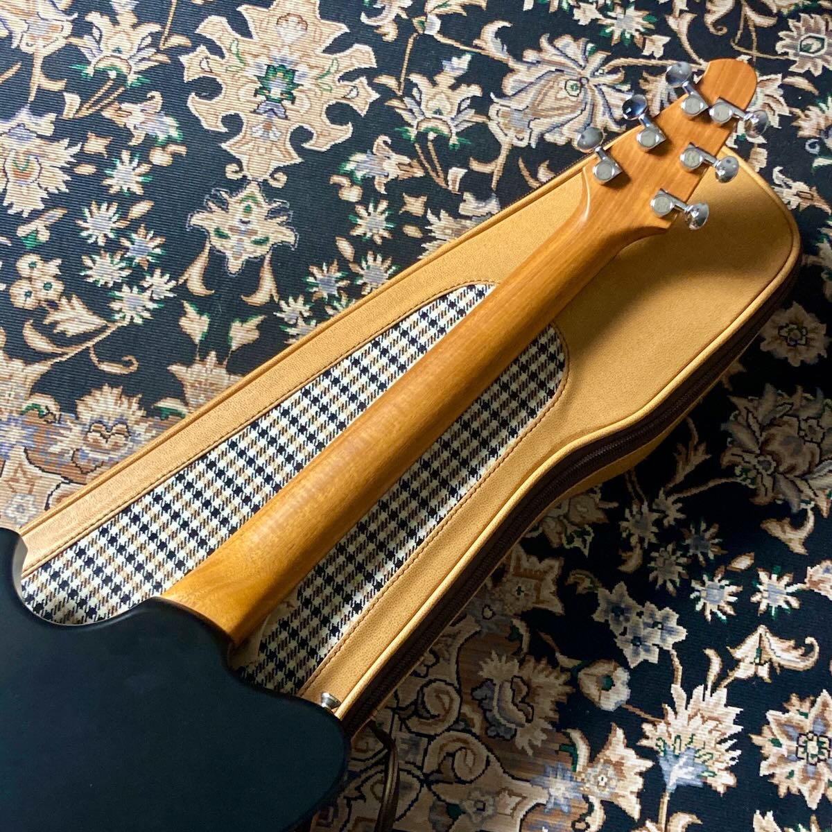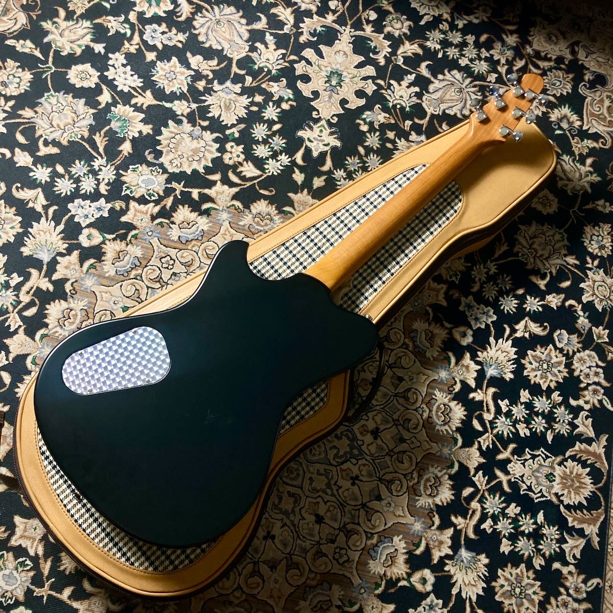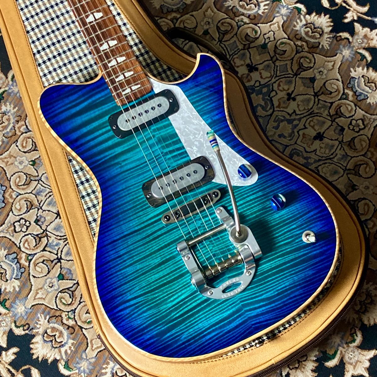 ボディーは海の色を思わせるブルーラグーン・カラーにフレイム杢が美しいメイプルトップ、ホロウ構造のアーバンアッシュバックを採用。クラシックカーやスケート、サーフボードを連想させる非対称のボディーシェイプは非常にクール。