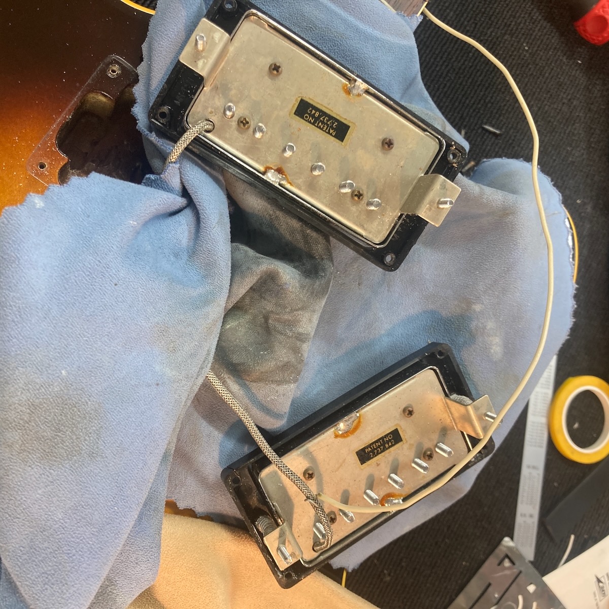ダークな色味のサンバースト、塗装はオリジナルですが、全体がオーバーラッカーされています。