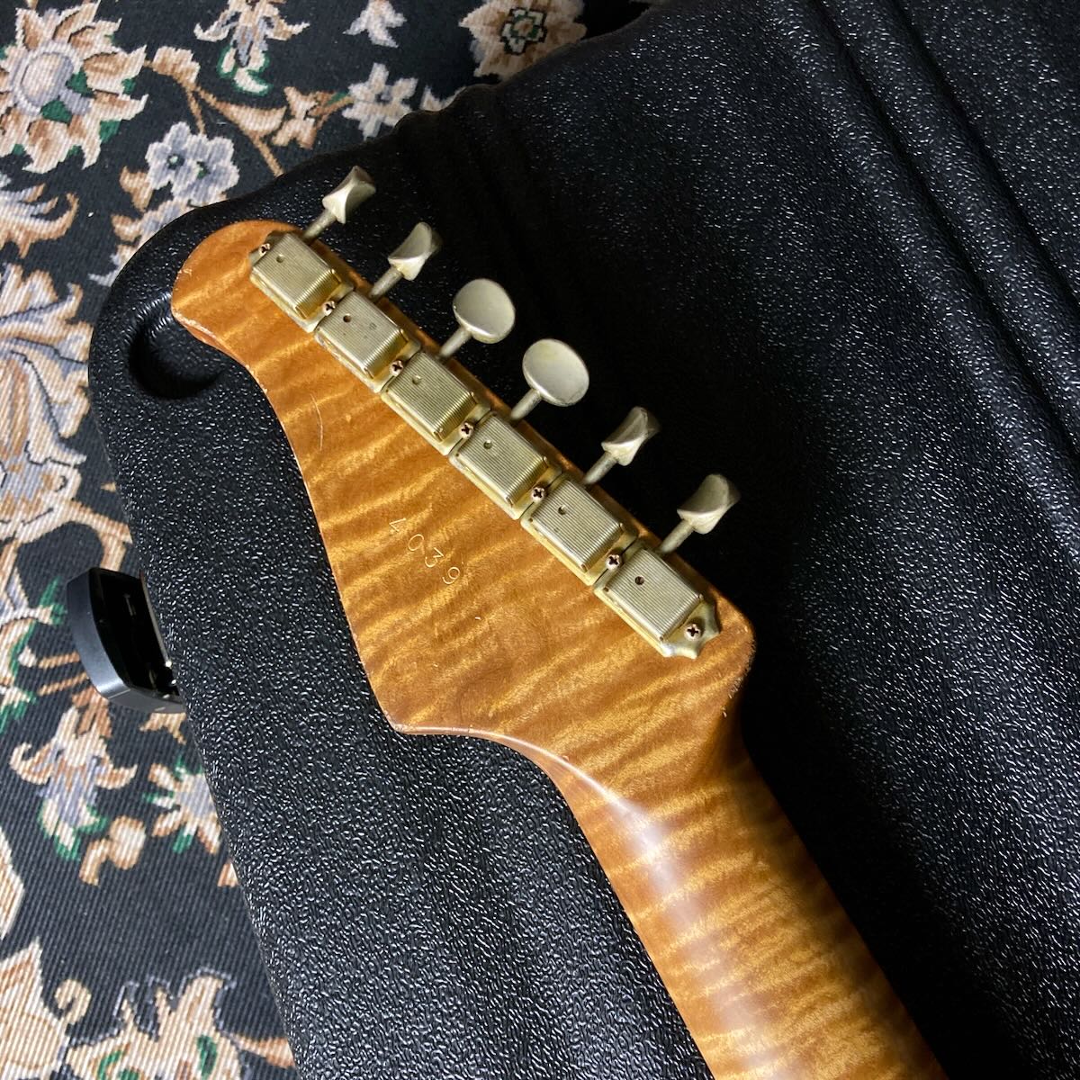 こちらの個体は、選定された5Aグレードローステッドメイプルならではのフレイム杢が美しいネックに、カスタムカラーのメルセデス・ブルーとヘヴィ・エイジド仕様!!