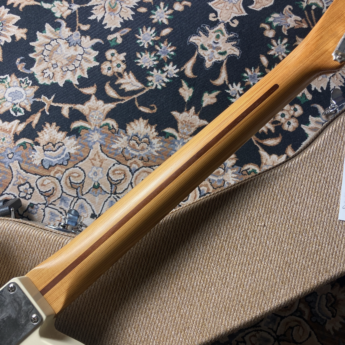 ボディーはソリッドのスパニッシュ・シダー、ピックガードの下にはFender 67年TLに見られるようなSmugglerスタイルのザグリが入っています。さらに、今回は軽量なボディー材でリクエストし、重量は約3.1kgとライトウェイト。ややエアー感のあるウォーミーなミッドレンジを持った個体に仕上がりました。